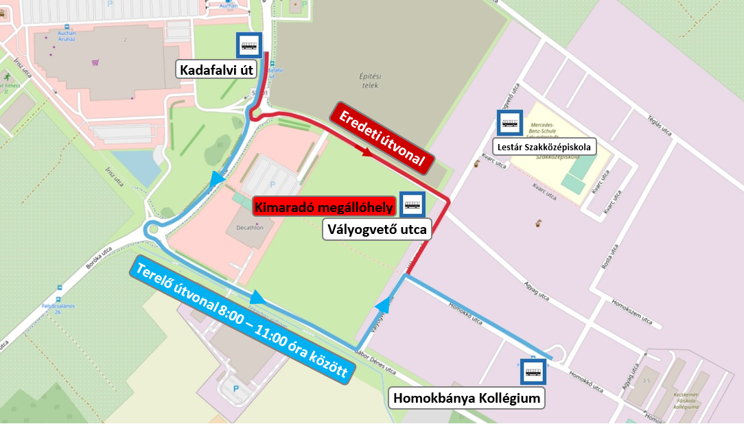 A jelzett időszakban a Noszlopy Gáspár park - Homokbánya Kollégium viszonylaton közlekedő 1-es jelzésű autóbuszjáratok terelő útvonalon közlekednek. A terelés következtében kimarad a „Vályogvető utca" megállóhely. Az autóbuszjáratokról való leszállásra, illetve felszállásra a „Vályogvető utca" megállóhely igénybevétele helyett a „Lestár Szakközépiskola" megállóhely igénybevételét javasoljuk.