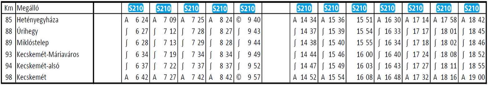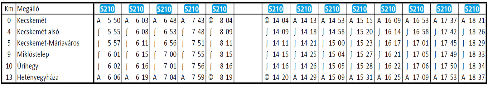 1. „Egy bérlettel autóbuszon és vonaton" integrált személyszállítási szolgáltatás Kecskemét és Hetényegyháza között A 2020. december 13-án életbe lépő országos vasúti menetrendváltozás időpontjától a 142. sz. Budapest - Lajosmizse - Kecskemét vasútvonalon munkanapokon az eddigi 2 helyett 11 vonatpár fog közlekedni Kecskemét vasútállomás és Hetényegyháza között. A személyvonatok valamennyi megállóhelyen meg fognak állni, így az Úrihegyben és Miklóstelepen élőknek is elérhetővé válik ez a többletszolgáltatás. Az életbelépő új vasúti menetrend szerint a következő időpontokban fognak személyszállító vonatok közlekedni: